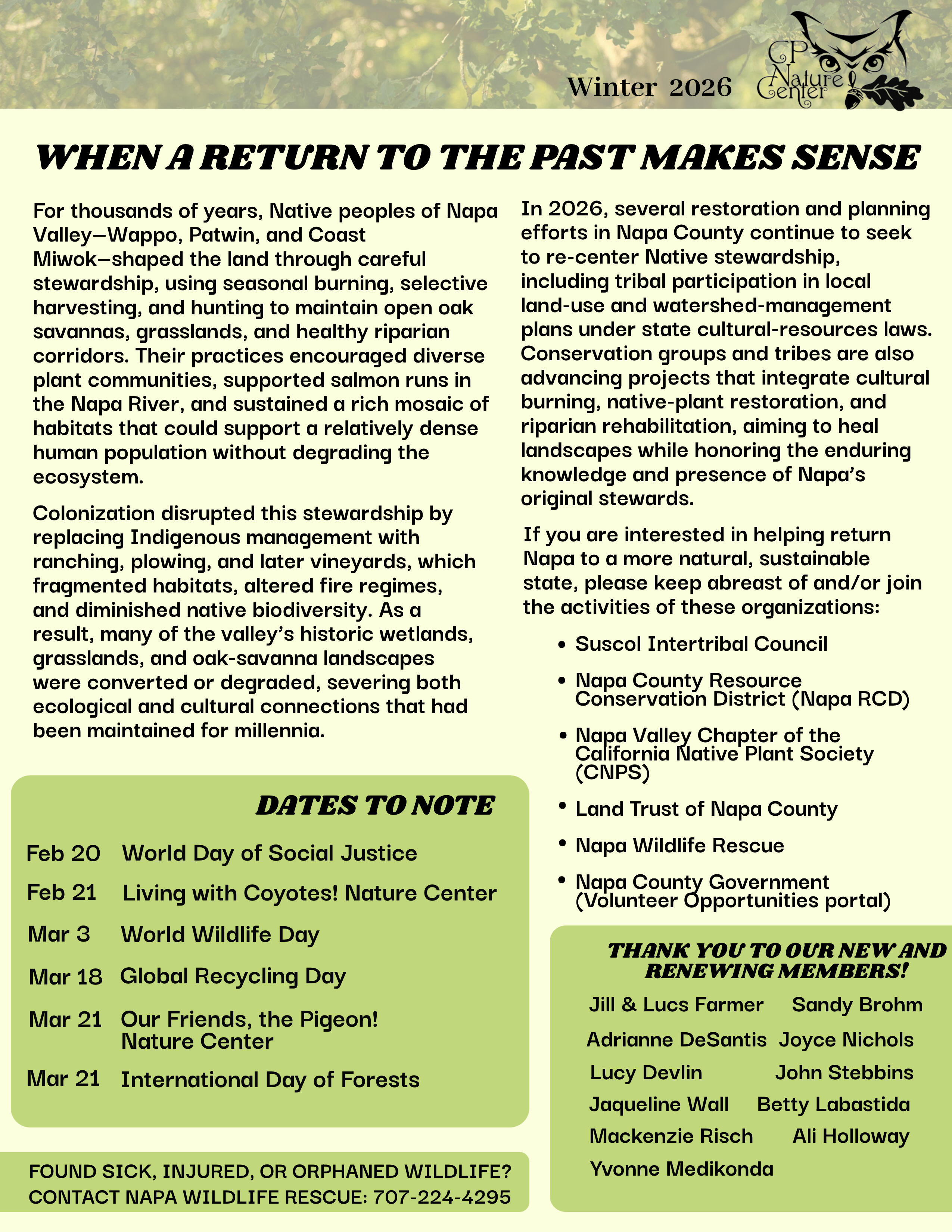 The Carolyn Parr Nature Center is managed by the wonderful volunteers of the Napa Valley Naturalists. If you would like to help in any way, please see our JOIN US page for more information, or contact us at cpnaturecenter@gmail.comWildlife Rescue Center