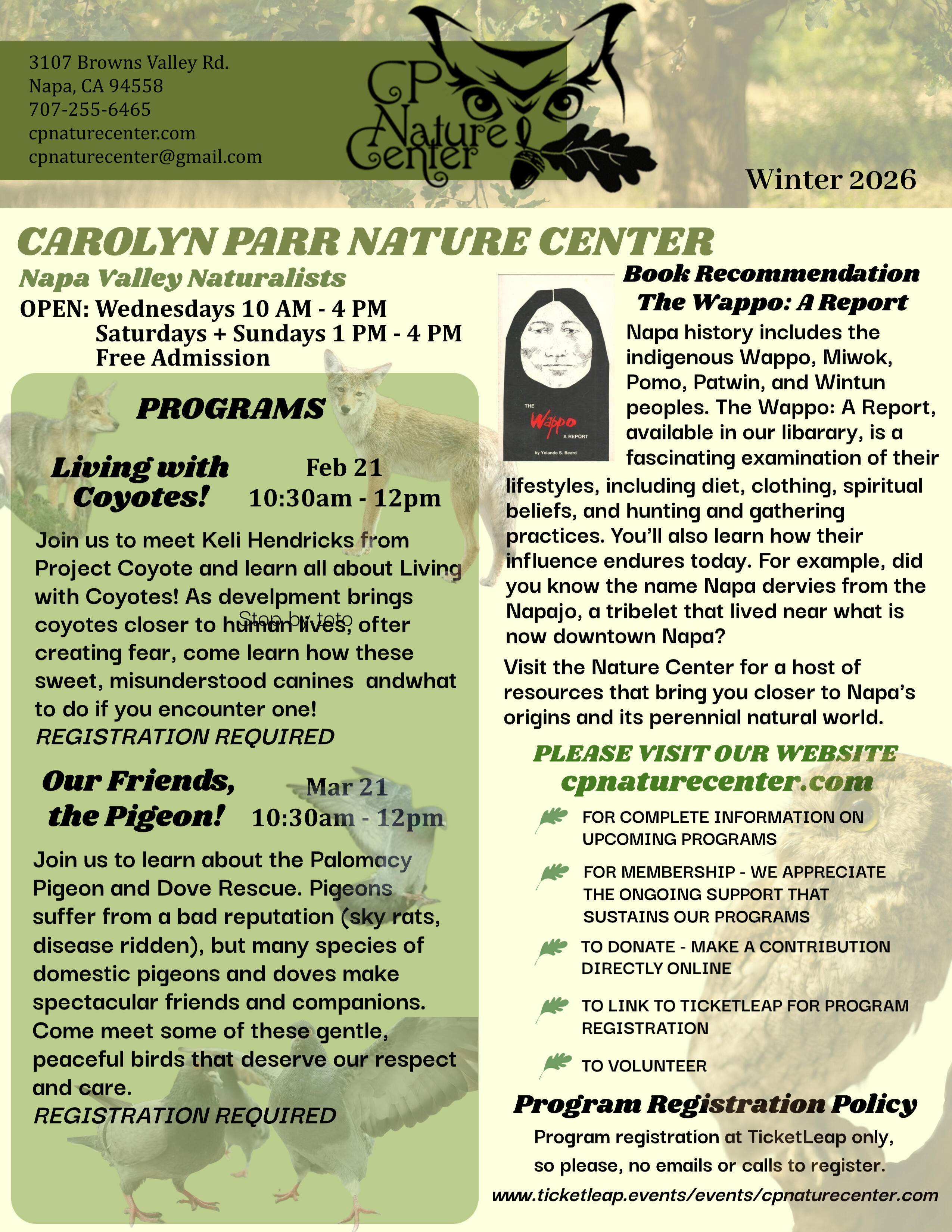 We are a non-profit, volunteer-only and community based Nature Center and Museum. Our mission is to provide education and community surrounding Napa's native natural environment to people of all ages. The Center is named for Carolyn Parr, whose generous bequest provided for its establishment in 1981.All programs are free to members of the Nature Center, and only $10 per adult for non-members. Group tours and school classes can be scheduled during the week by calling the Nature Center.